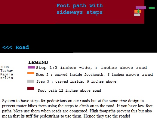 Demerits : is not wheel chair friendly. No work around for this as they are small vehecles and unfortunately making a path for them will be misused by other vehecles. For that we need other changes.